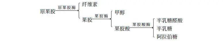 未成熟的水果中是原果胶,逐渐成熟后变成果胶,最后在水果后熟中,果胶被分解。