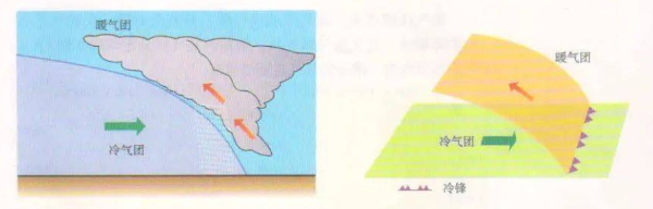 (2)暖锋雨:暖空气主动推进,缓慢爬升到冷空气上方,降雨强度小、时间长,范围广。