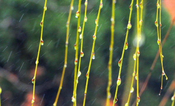 2013年雨水时节,苏州街头柳枝上爆出的嫩芽在绵绵春雨中。(图片来源:新华社)