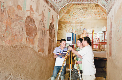 历经岁月侵蚀,石窟里的壁画和佛像非常脆弱。“有些壁画已斑驳不堪,稍有大意就可能造成破坏。”黄先锋说,每次在洞中安放测绘仪器设备时,科研人员都倍加细心。因保护需要,许多石窟并未开放,风、光线及呼吸时产生的二氧化碳,都会对洞内文物造成破坏。每次进洞,必须严格控制时间,接电、架灯、拍摄都得抓紧。