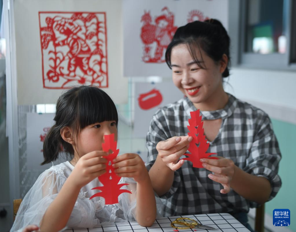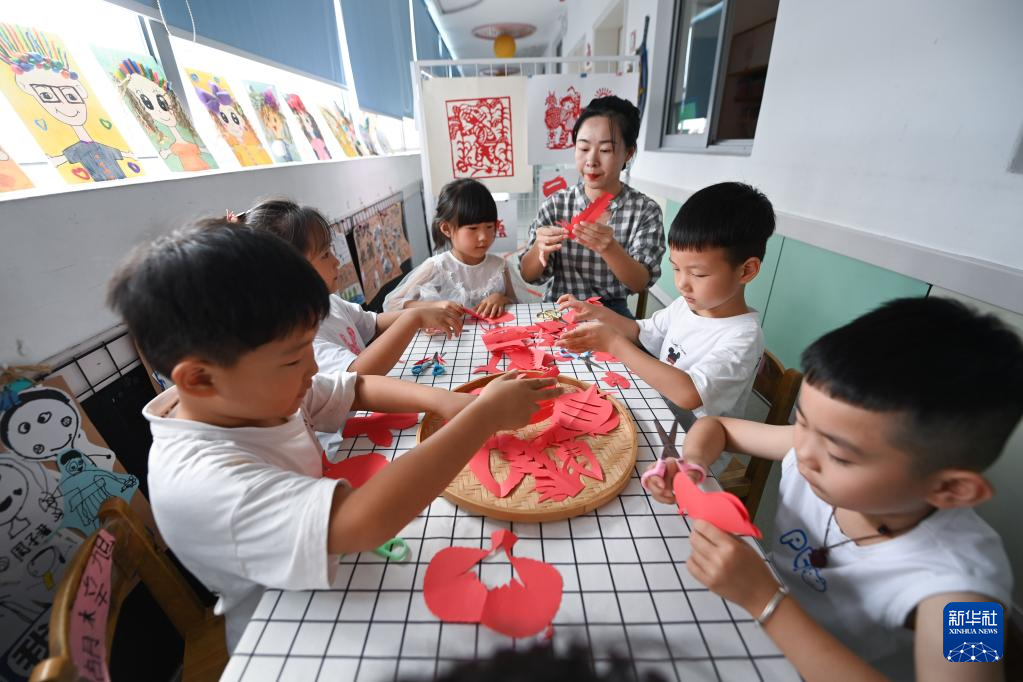 9月20日,老师指导孩子们剪出青菜造型的剪纸作品。新华社记者 徐昱 摄