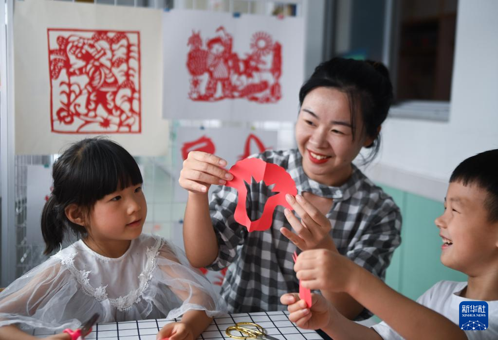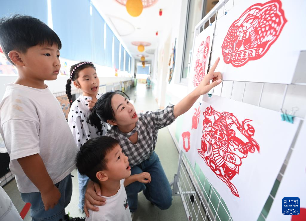 9月20日,老师在给孩子们介绍以中国农民丰收节为主题的校园剪纸作品。新华社记者 徐昱 摄