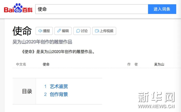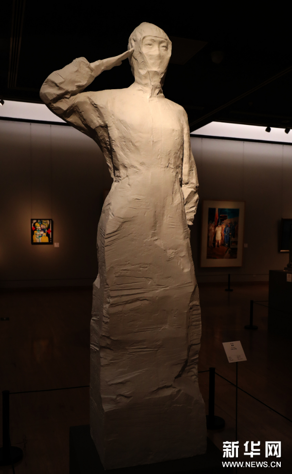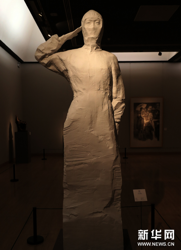 武汉的抗疫精神被广大艺术家通过各种方式进行形象记录,他们以大爱之心、大美之艺,为抗疫志士们塑形画像,留下光辉风采、凝聚团结精神、传达真挚情感。作为国家主题性美术创作项目雕塑创研班导师,吴为山不仅在第一时间组织全国青年雕塑家“为抗疫而塑”,迅速创作了一批表现抗疫感人情景的佳作,更有感于无数怀着崇高使命感的医护工作者奔赴抗疫第一线的大无畏精神,激动地创作了雕塑《使命》。这座雕塑表现了一位90后女军医的形象,她身着洁白的防护服,高举右手,庄严敬礼。虽然口罩遮挡了她的面容,人们却能感受到在她直视前方的目光中所透露出的坚毅与果敢。女军医的下半部分被塑造成石块状,表明了这是一座新时代医务工作者的圣洁丰碑。《使命》象征着所有拼搏于第一线的医护人员,在其庄严的敬礼下,涌动着对生命的尊重和对职业神圣使命感的赞美。她们是新时代最可爱的无名英雄。