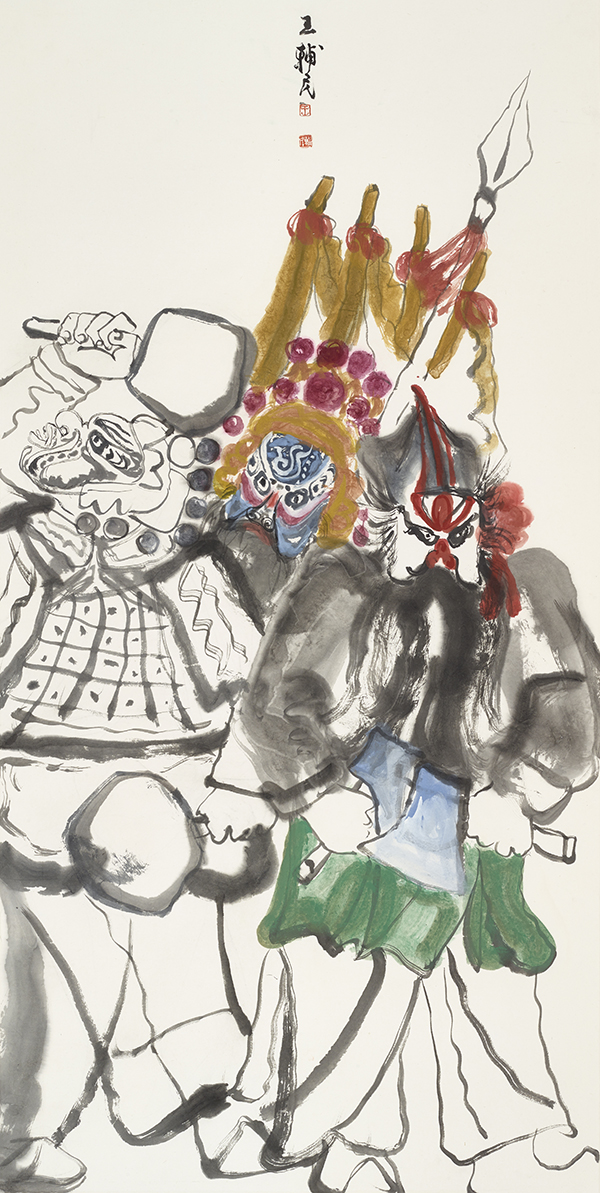 王辅民这几年的探索深深植根于西北的生活,他画的这些人物实际上是把中国民间艺术和中国民间文化对真善美的追求,通过笔墨语言的形式、通过造型语言的变化、通过画面情趣的呈现,给我们创造了一个民间艺术的梦想之境。其作品最大的自由是把社戏的人物跟中国文化所倡导的真善美融合在了一起,这是它的内涵,也是它的主题。正是在这样一种人文情境下,他的作品更多地在形式语言和笔墨语言的建构上,通过对传统文化的理解,更有深度地表现了当代水墨文化探索的语境,也艺术地呈现了一个当代艺术家对民间艺术的体会和理解,以及对传统文化的吸收与再创造。他在造型语言的研究、画面图式的研究、民间艺术结构的研究,和色彩的研究上,都有很大的突破。在这种突破中,王辅民逐渐把民间艺术强烈的人物设计和脸谱化造型转换为一种文人画的笔墨情趣。这批作品呈现了王辅民的学术成就,相信这将为他今后深入挖掘时代人文内涵和中国画的笔墨精神提供最好的基础。