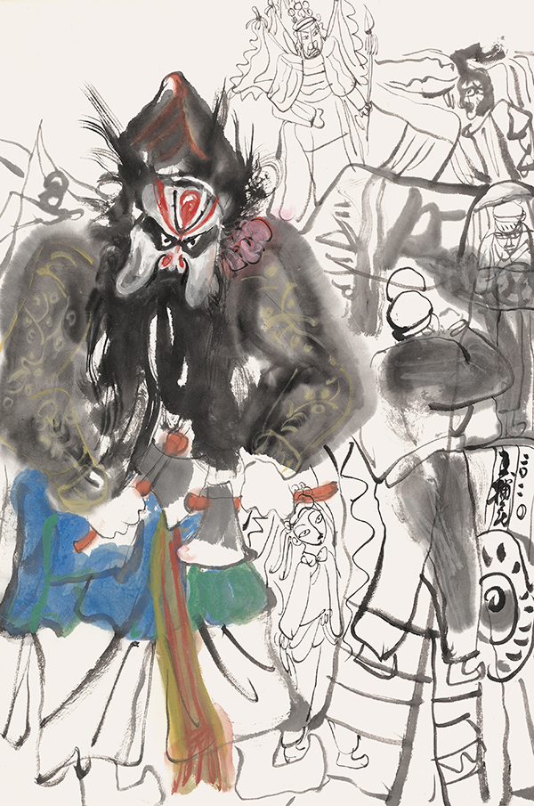 他对于乡土文化的描写无疑具有表现性色彩,而这种表现性都自觉地汲取着这些原生美术的艺术养分。剪纸与皮影因在单薄的平面上塑造形象,便不得不最大限度地简化形象的侧影。镂空作为这种形象塑造的唯一语言,不仅具有造型功能,而且兼备改变造型的视觉形式感,使得意象造型在剪纸与皮影的艺术创造中获得了极大的发挥。他从民间文化中所接触的中国本土文化精神与现代视觉元素,无疑为中国画的现代性探索提供了一个新案例。
