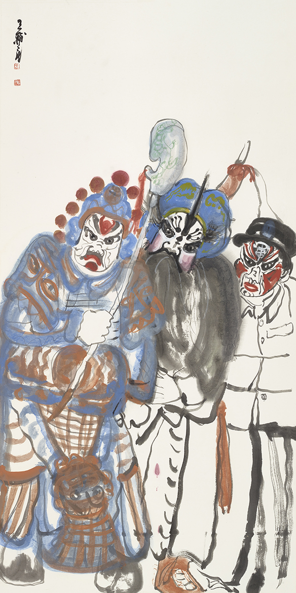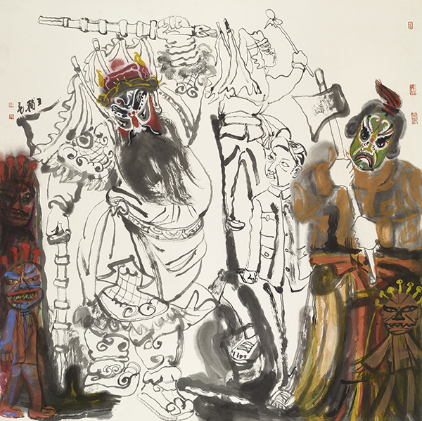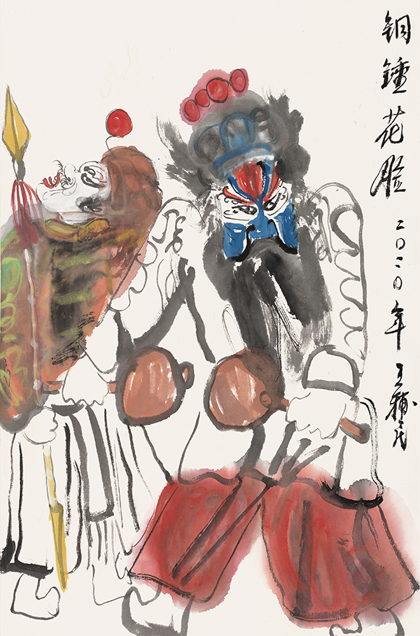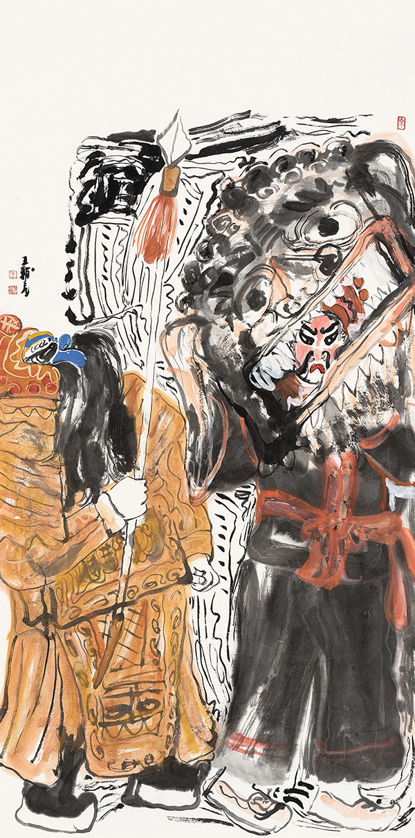 中国社火题材的大写意中的“写意”这个概念的包容性很大,也可以有痛苦的宣泄,如徐渭、八大山人的某些作品,但即便如此,那些作品也是美的,是中国式的。王辅民画的社火是传统写意画的形式,是笔墨和传统色彩在说话。社火和西方的狂欢节比较相似,是外在、热闹、欢乐的基调,不是内在的、孤愤的、批判的基调。它可以荒诞幽默、可以升华发展,是一种中国式的狂欢。社火本身既有内容,也有形式。画社火,要重内容和形式。作为绘画的社火,可以分为两类,一类是画社火本身,如同关良画京剧人物,画出独特的风格和意趣。另一类是把传统社火与现实题材结合起来,即辅民说的“切入现实”,传统社火与现实人物融为一体,成为具有共生内容与形式的现代观念性绘画。这两类绘画,都具有社火的幽默夸张、动态诸元素。前者则应像关良一样,越画越简练、传神。像关良那样熟悉京剧,熟悉文人画,熟悉传统笔墨等等,达到很经典、很中国,能与传统绘画的精髓接得上。后者则以二者的结合,以表达某种现代性的观念为目标。前者属于有生命力的古典绘画,后者则趋向杂交性的现代绘画。