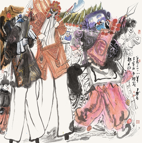 王辅民是中国当代人物画家中一个很值得研究的个案。我和王辅民曾共同探讨过中国文人画创作的问题,因此关注他的作品已经很久了。今天推出的这个展览,集中展现了王辅民近些年来的艺术探索,有反映现实生活的题材,也有他这些年精心计划的学术研究成果。在我看来,这是王辅民个人艺术风格、创作面貌最为成系统、而且取得了一定成果的一次集中展示。作为当代的中年画家,反映社会现实是王辅民近年来创作的主题。他把生活中西北的民俗“社戏”作为一个艺术元素,这种类似皮影、剪纸的民间元素和节庆的队列相结合,形成了一种似写实而非写实的具象表现主义手法。此外,他在水墨人物画的创作基础上融进了颜色,既有大块的笔墨上的形式语言,也有色彩的精心设计。这些年来,王辅民在研究艺术语言本身的同时,不断精进艺术形式的表达,他的画面变得更加精湛,更具设计感,并带有某些现代艺术的元素,很有特色。