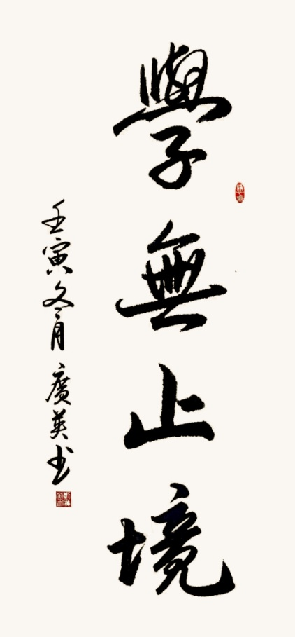 书法艺术与中国文学天生有一种深切的因缘关系。然而在当代就书法艺术这一方面来说,它对中国文学有着更强的依附性。当代文学可以不依赖书法艺术来表现,但当代书法艺术离开了文学内蕴,就显得苍白无力。刘广英的书法特点最具文人抒情性,这缘于她自身的禀赋与修养使然。“观人于书,莫如观行草”,行书,是最能胜任“达其情性,形其哀乐”的书体。刘广英作为文人,学养丰厚,思绪的线条连贯而流畅,正与行书抒情特性的线性书写相契合。其字书写畅达、抒情自然、卷气充盈,具有妍雅飘逸的风格,有一种温文尔雅的正人君子风范,素挥雅操、清声随风起的境界。轻快的笔调,自然大方,超然不拘,流畅的线条,表现出一种潇洒飘逸、倜傥风流的名士之美,如李太白诗“兴酣落笔摇五岳,诗成笑傲凌沧洲”。书作《学无止境》注重“势”的把握,笔势飞动,用笔稳健。其字尽含“参己意”“追古法”的洒脱与遒劲之美。书作《春和景明》字主藏锋,用笔秀润,遒逸飞动,结构精密,肉骨均和,表现出高贵秀美的气质。