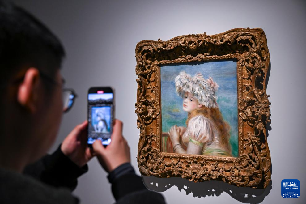 1月21日,媒体人员在“印象·派对”艺术大展拍摄雷诺阿的作品《戴蕾丝帽的女孩》。