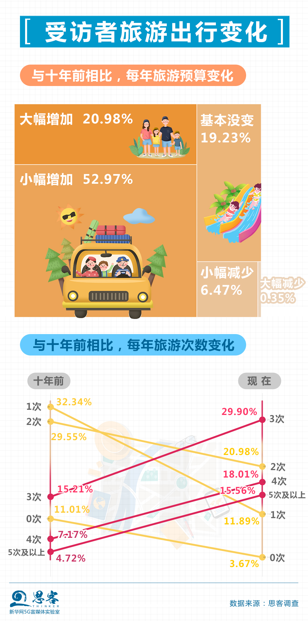 每年出游3次的受访者比例增加,旅游休闲消费需求越来越旺盛。思客调查显示,与十年前相比,每年出游三次的受访者比例增幅最大,由15.21%增至29.90%。每年出游1次的受访者比例降幅最大,为20.45%。每年不出游的受访者从11.01%降至3.67%。