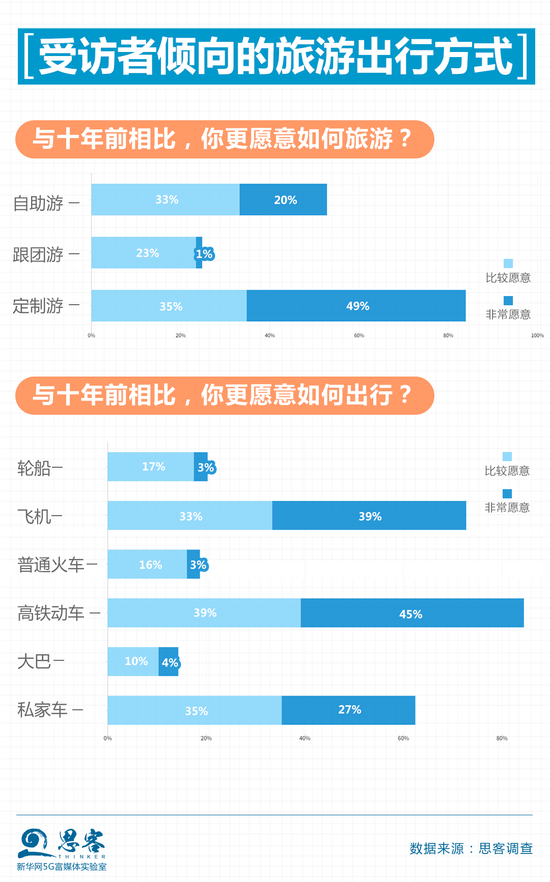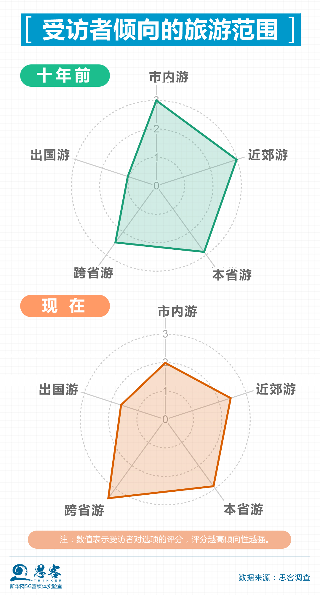 “我的旅行我做主”,在旅游范围和方式上公众都有了更多选择。思客调查显示,与十年前相比,选择跨省游的受访者占比明显增加。“中国那么大,我想去看看”不仅仅是在景点打卡拍照,而且是心灵的舒适与文化需求的满足。