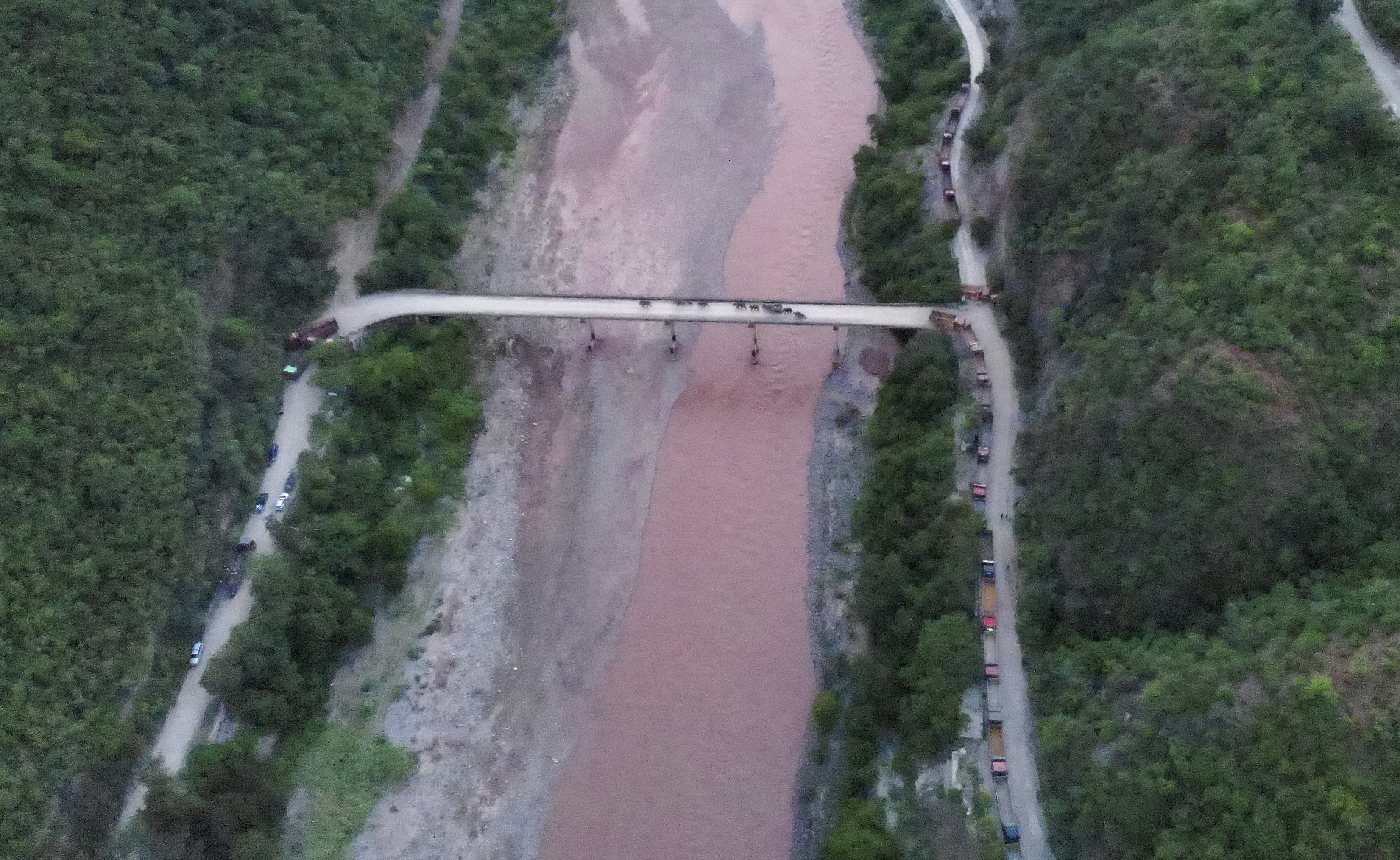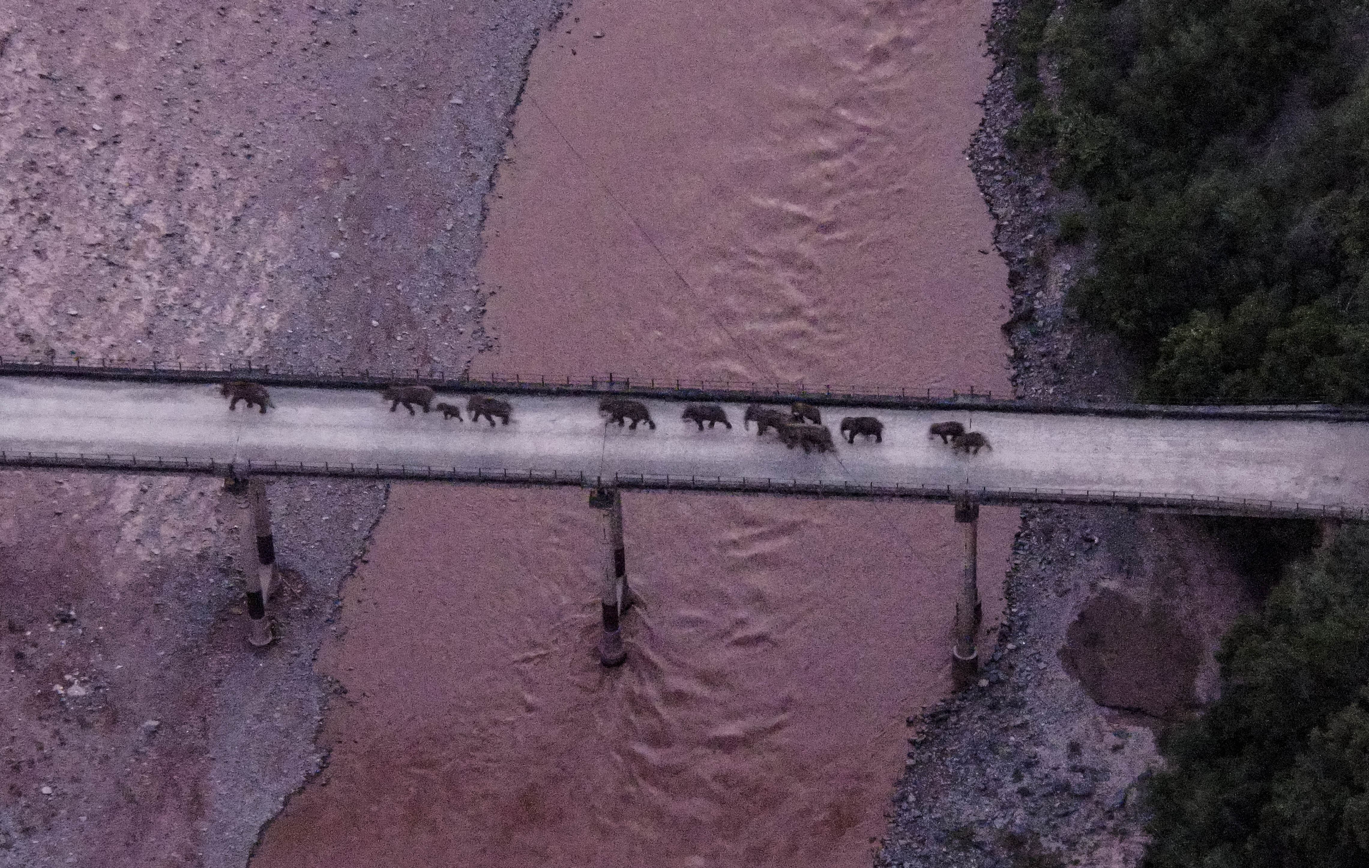 ▲象群通过老213国道元江桥(无人机照片,8月8日摄)。新华社发