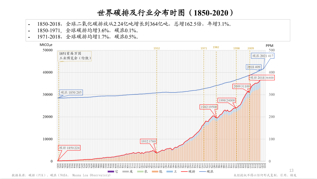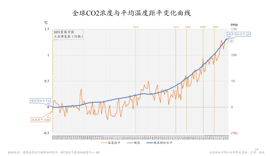 如图11,1851年,第一届世博会在伦敦举办,工业化尚处于早期。直至今日,工业化持续推进,碳排放量持续增长,二氧化碳浓度也在持续增加,与之相应地,世界平均气温也在不断上升。2021年诺贝尔物理学奖得主真锅淑郎在模型预测中指出,全球二氧化碳的含量每翻一倍,全球均温会上涨3摄氏度。如今全球二氧化碳浓度增加了45%,气温也增加了3摄氏度的45%,即1.34摄氏度左右。