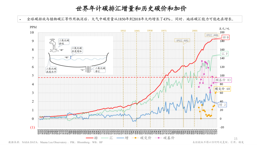 我们可以通过一个简单的类比来理解碳中和的概念(图12中的左上方小图)。碳排放就像是水龙头往水池里放水的过程,而这个水池有一个出水口,那么假设每年排放量为9ppm,而碳浓度增加了3ppm,那么就有6ppm的碳从“出水口”溜走了。这也就意味着,假设我们将碳排放量从9ppm降至6ppm,那么水池里的水可能就不会再增加,即碳浓度也不会增长,碳中和的目标就实现了。不过,这意味着现在全球的碳排放要削减30%。