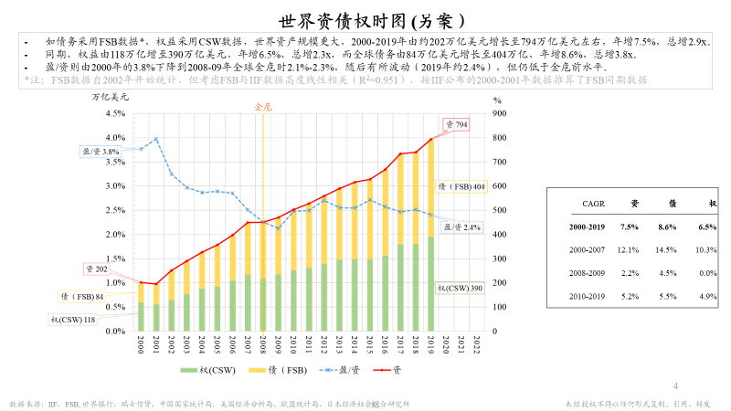 如图2,为了与国际金融协会的数据相互印证,我们还利用金融稳定理事会(简称FSB)的债务数据进行了一次估算。FSB是2008年之后世界各国政府之间建立的组织,它从风险防范的角度尽最大可能来统计各国债务,因此它的数据更加全面,囊括了几乎所有可以统计到的债务。事实证明,FSB的数据虽然数值更大,但它与国际金融协会的数据在趋势上是相吻合的。同样,为了核对权益数据,我们还另外使用各国国家统计局(NSB)的数据、瑞士信贷的全球财富(CSW)数据以及世界银行的生产资本(WBC)数据进行比较,得出的结果较为一致。因此,综合来看,前文中关于权益和债务水平的测算是具有可靠性的。