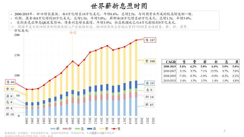我们来通过图5看看世界的薪酬、折旧、利息和盈利几个经济分配项目的规模变化。2000年至2019年间,世界固定资产的折旧规模增长了10万亿美元(折和年均增速6.6%),增速比图中其它几项更快,与同期世界资本形成的较高增速相一致。