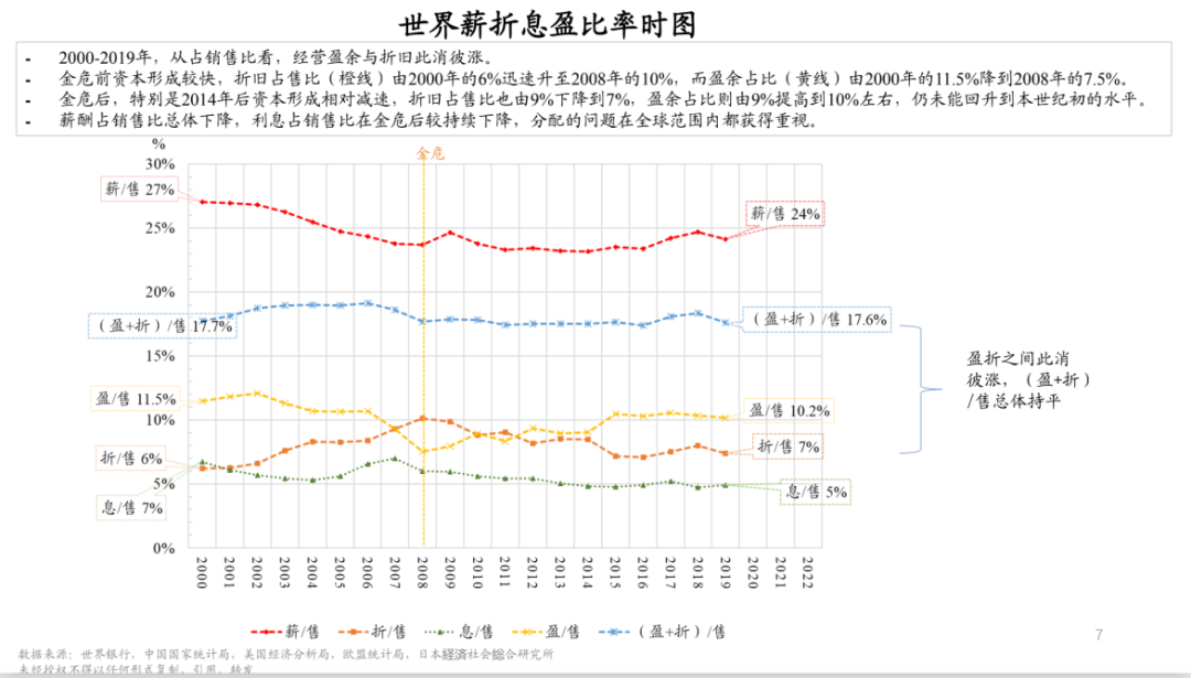 我们再来看看下图(图6)中企业及企业所有者分配的份额(蓝线),即盈利与折旧之和占销售总额的比例,也基本保持不变。企业受到2008年金融危机等影响相对略小。而从居民的角度看,一方面,薪酬占销售总额的比重(红线)从危机前的27%下降至如今的24%;另一方面利息在逐渐下降。也就是说,与居民部门的利益密切相关的薪酬和利息都在逐步下降。因此,在经历一场危机之后,企业部门的分配可能并没有变得更差,而居民部门有所下降。企业部门和居民部门这两种不同的发展态势也能够在一定程度上解释美国等20年以来的一些社会分歧现象。