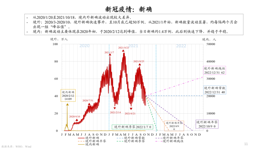 首先是疫情。如图8,境外新增确诊病例在2021年初迅速增长至80万人的水平,此后基本在此基础上下波动。根据2020年的经验,病毒在冬季可能会扩散得更快,但从全球的确诊数据来看,不同季节似乎并不存在显著差别,不过这也可能是因为南北两个半球的季节相反,使得新增确诊病例在时间维度上趋于平衡。