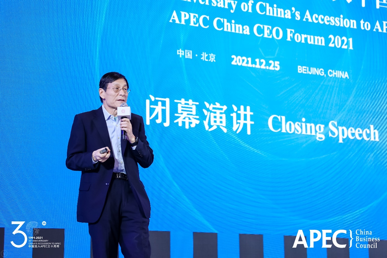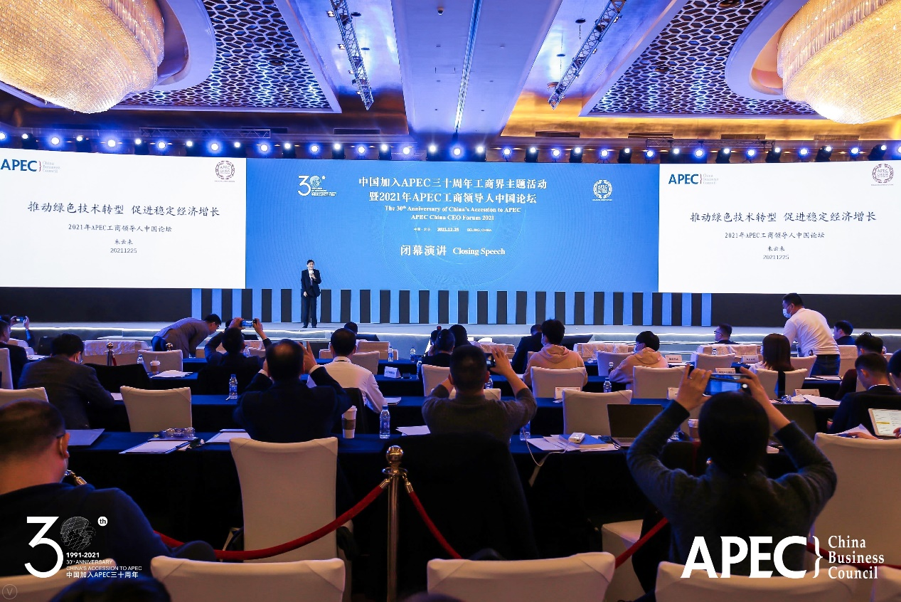 12月25日,中国加入APEC三十周年工商界主题活动暨2021年APEC工商领导人中国论坛在北京举办。APEC中国工商理事会副主席、金融专业人士朱云来出席并作题为“推动绿色技术转型,促进稳定经济增长”的闭幕演讲。