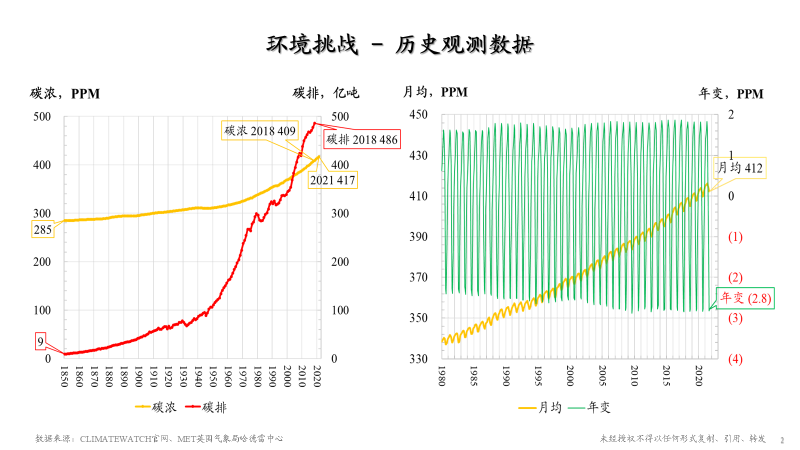 首先,我们来看看双碳目标背后的环境挑战。通过左边这张图中红线可以看出全球二氧化碳排放近170年来呈系统增长趋势,从1850年约9亿吨到2018年的486亿吨。这是一个巨大的增长,也是人类经济活动造成的。大家都知道首届国际工业博览会是1851年在伦敦举办的,这也基本上标志着全世界工业化的肇始,因此1850年作为碳排放记录的开端也是有标志性的。同时我们可以看到环境的变化,就是这个黄线表示的大气碳浓度,从285ppm到现在417ppm,涨了近50%。右边这张图,黄线含义和左边一样都是碳浓度,不一样的是右边这个是月度资料,左边是年度的。从月度来看,可以看到二氧化碳浓度年度变化是有周期的,把这个周期提取出来就是碳浓度年变化率。通过这些数据我初步推算出来世界的碳排放出来后最终都上哪儿去了。