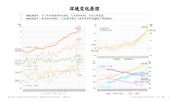 再来看看碳排给海洋带来的后果,二氧化碳溶解到水里面会变成碳酸,使得海洋酸化。右下角这个图,黄线是大气里面的二氧化碳浓度,蓝线是海水里面二氧化碳的浓度,而朝下发展的紫线代表的是海洋酸度观测,可以看出来它从PH值8.13左右,一直下降到8.063,我们都知道PH值越接近于7就代表着越往酸的方向走。海洋酸化对海洋生态的冲击是巨大的。举个例子,我们知道很多海洋动物是贝壳类的,而贝壳主要成分就是碳酸钙,海洋酸化之后会溶解它们的贝壳,珊瑚礁也是同样的,如果海洋继续酸化加剧可能会导致该种类生物的灭绝,一旦生态链被破坏,我们应该要担心这样的冲击,可能比在大气里面温度升高的冲击还要大。