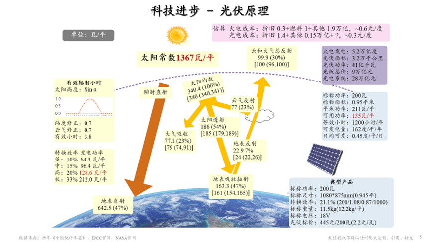 我们先来看看图中的太阳常数,这是很重要的参数。生活在太阳系里面,太阳几乎是我们所有能源的唯一来源。经过长期的观测,包括现代卫星的观测,我们总结一下太阳给地球的能量强度是多少呢?每平米1367瓦,这就是太阳常数,它到了大气的顶(紫虚线)后穿透大气,射到地面,但是因为在中间云层、大气会被吸收、被反射,包括到地面也有一部分反射,最后能够实际到地面利用的是47%,也就是约640瓦。这640瓦还要经过光伏转化,就是图中画的光伏板,要把太阳能接收,但是目前最好接收转化比率也就20%左右,据物理学家估算光伏板最高的转换极限是33%,如果转换到33%,每平米最后可以有212瓦,和日常100瓦电灯泡的功率单位是一个意思,看起来不大,但这只是1平米而且它每一天都在接收能量。我测算了一下,按照现在中国火电发电量,年发电5.2万亿度,如果用光伏来替代,大概需要多大面积的光伏电池呢?计算结果我放在图中靠右的紫色的方块里,大概需要3.2万平方公里,不到我国国土面积 960万平方公里的1%。海南岛的陆地面积大概就是3万多平方公里,也就是说我们需要像海南岛么大的地方铺上光伏电池,从总量来看是可以替代现有全国煤电的消费需求。当然这还只是初步计算,需要更多专家一起做更为系统的论证。在这儿只是想提示一个可能性的思路,如果论证这个思路可行的话,后边就可以讨论具体如何完成绿色转型,并在同时帮助经济稳定运行。