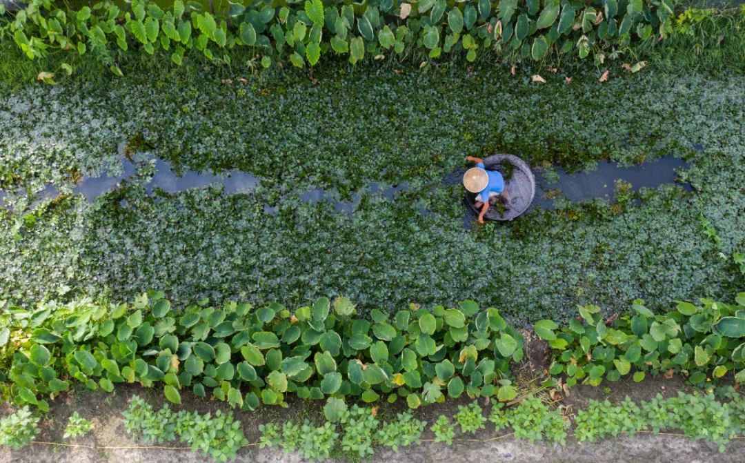 ▲东林镇泉庆村的种植户在水塘里采收菱角(无人机照片)。新华社记者 徐昱 摄