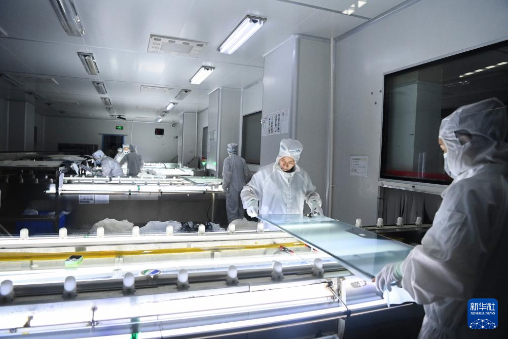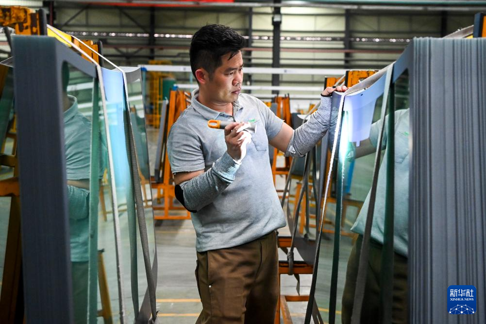 在位于广西北海市铁山港(临海)工业区内的一家玻璃生产企业,工作人员对成品汽车玻璃进行质检(3月13日摄)。
