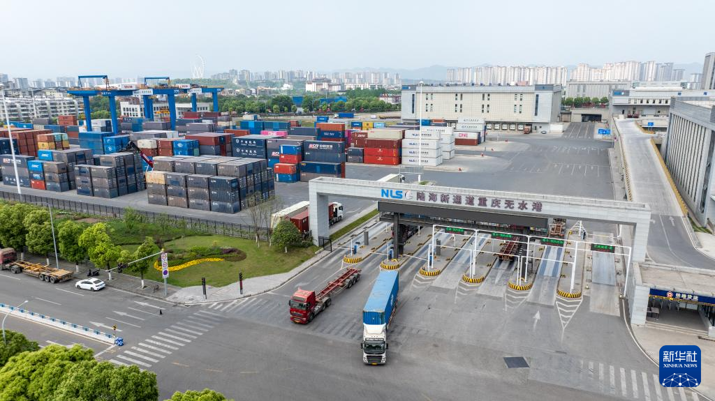 4月17日,在重庆国际物流枢纽园区,转运卡车在陆海新通道重庆无水港转运装有玻璃制品的集装箱(无人机照片)。