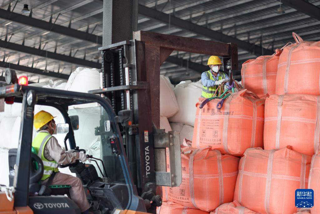 4月18日,在重庆市永川区,一家玻璃生产企业的工作人员在原料车间码放依托陆海新通道从青海运输过来的纯碱。