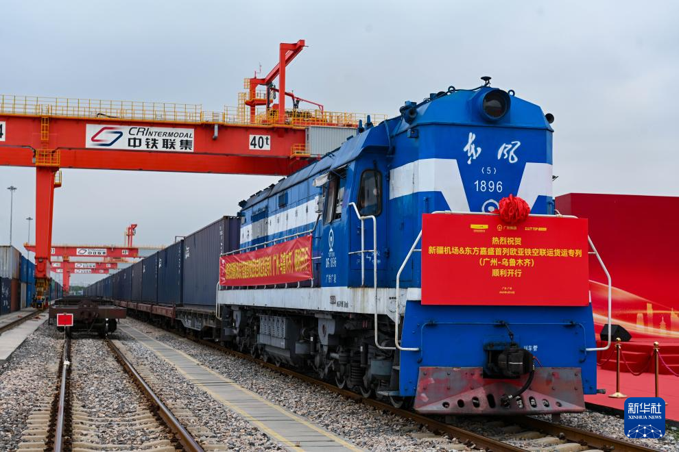 当日,“粤新快线”铁空联运专列首发仪式在广州国际港站举行。该专列采用“铁路干线+航空接驳”模式,通过广州-乌鲁木齐铁路干线衔接乌鲁木齐国际机场的欧洲航线网络,大幅降低运输时间和成本。