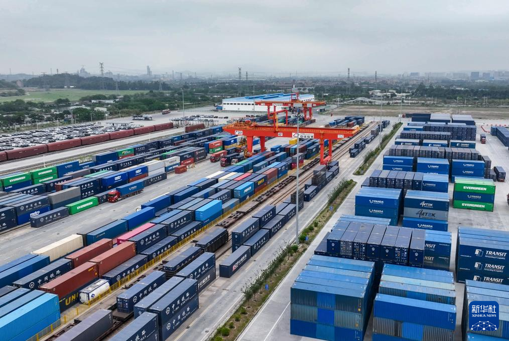 这是4月18日在广州国际港站拍摄的“粤新快线”铁空联运专列。