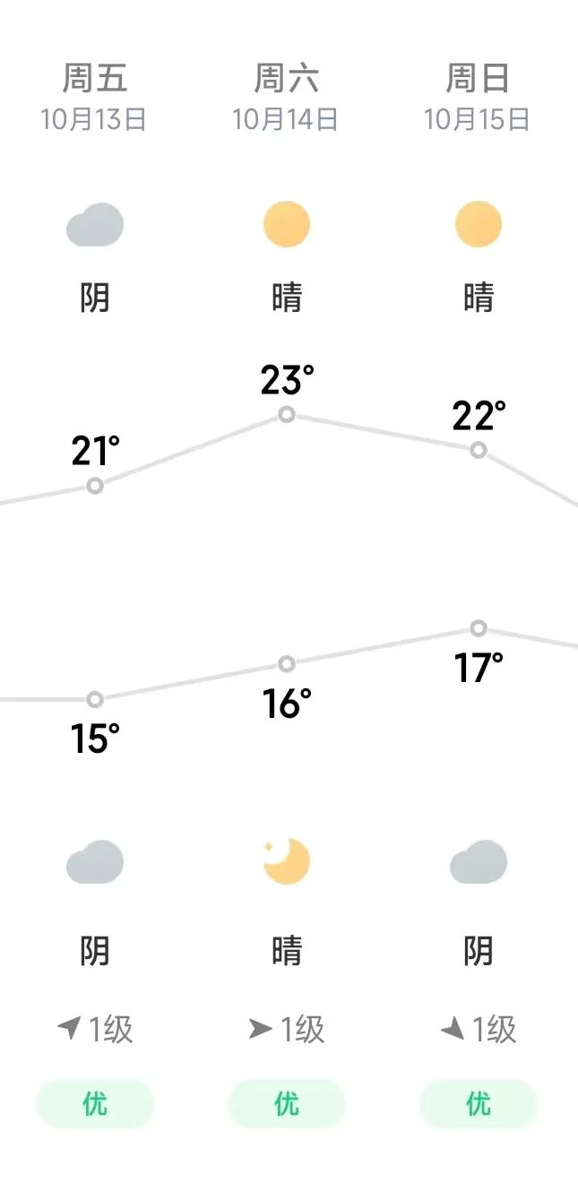 总体天气十分舒适,早晚体感温度会稍许偏低,别忘了准备好衣物,注意保暖!