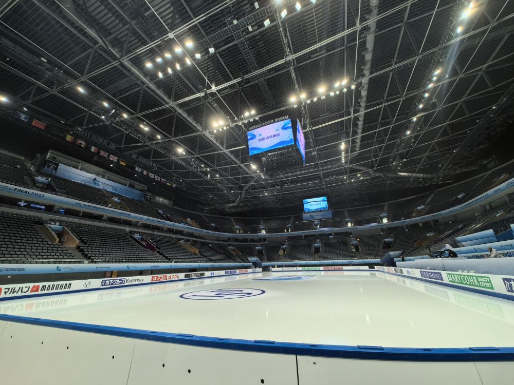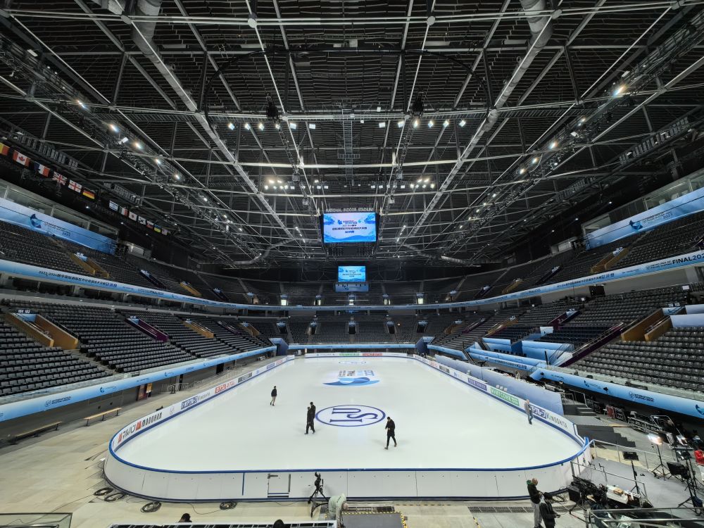 场地中央,此次花滑大奖赛总决赛赛事会徽“冰帆”已“埋”于冰下。相较于冰球比赛,花样滑冰运动的冰面温度更高,冰面更厚,硬度更低。本次制冰团队均由中国制冰师组成,团队曾为北京冬奥会、花滑大奖赛中国杯(重庆站)的比赛提供保障服务,具有丰富制冰经验。