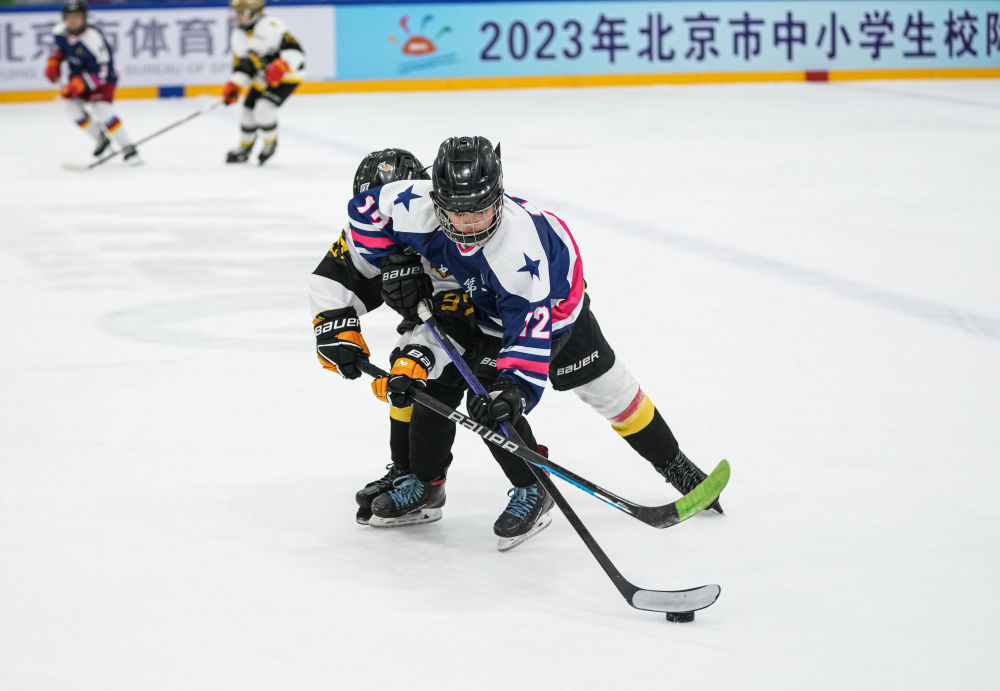 5月13日,在国家体育馆冰球馆,中关村第三小学队球员付号(前右)与北京市朝阳区凯文学校队球员向纳德在2023年北京市中小学校际冰球联赛中拼抢。新华社记者 吴壮 摄