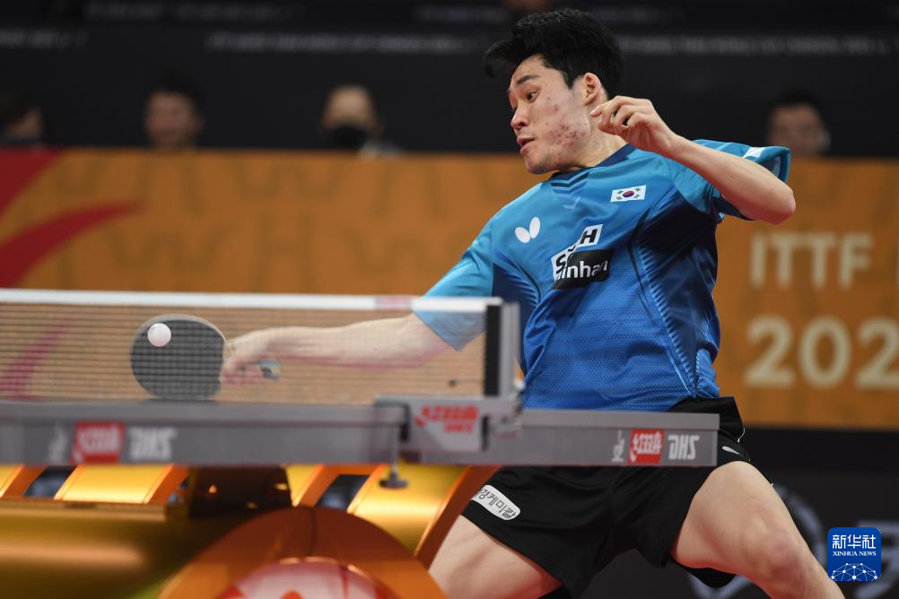 12月8日,韩国队选手张禹珍在男单比赛中回球。他以2比1战胜日本队选手张本智和。新华社记者 胥冰洁 摄