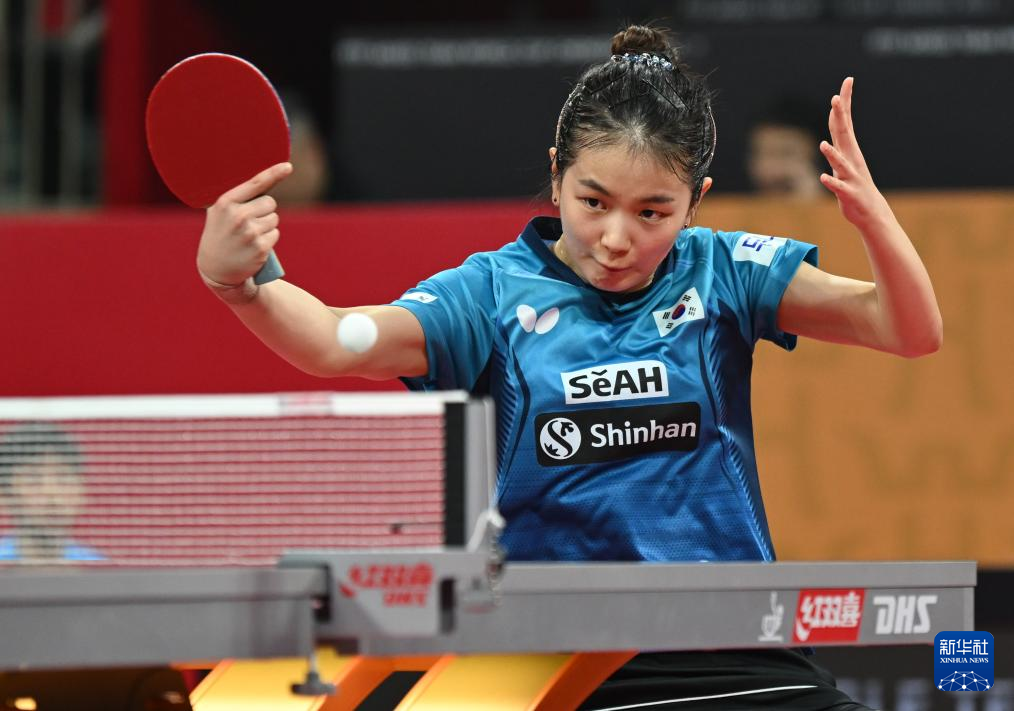 12月8日,韩国队选手金娜英在女单比赛中回球。她以1比2不敌日本队选手早田希娜。新华社记者 胥冰洁 摄
