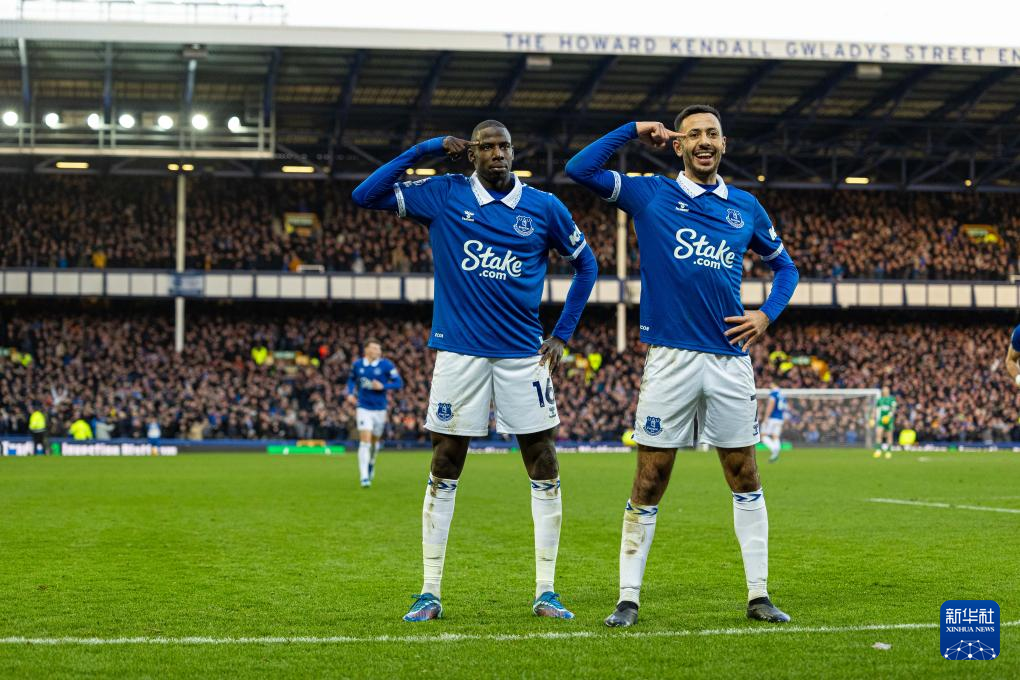 12月10日,埃弗顿队球员多宾(左)在比赛中庆祝进球。新华社发