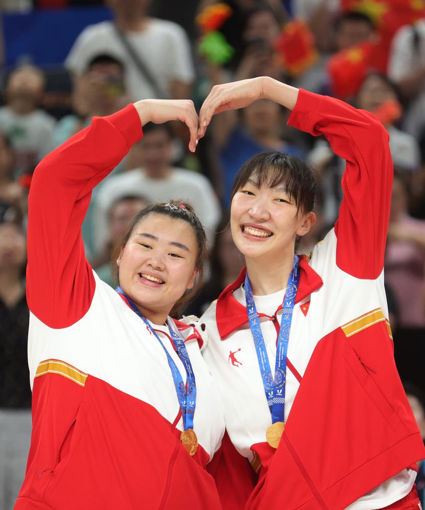 8月5日,中国队球员刘禹彤(左)和韩旭在颁奖仪式上比心庆祝。新华社记者 杨青 摄