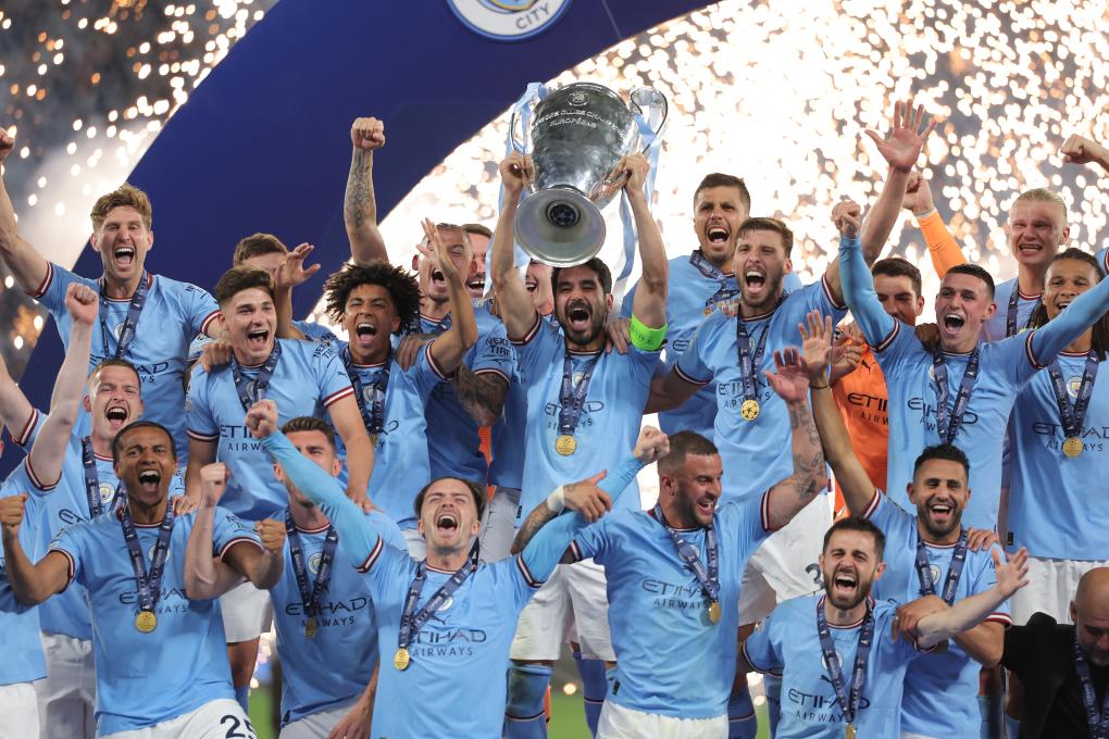 这是2023年6月10日,曼城队在颁奖仪式上庆祝夺得欧冠冠军。新华社发