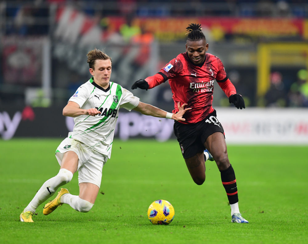 12月30日,AC米兰队球员莱奥(右)与萨索洛队球员彼得森在比赛中拼抢。新华社发(阿尔贝托·林格利亚摄)
