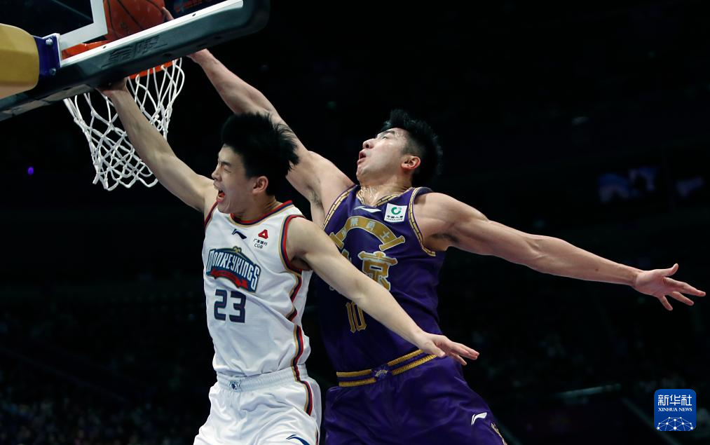 12月30日,北京控股队球员邹雨宸(右)防守南京头排苏酒队球员林葳的上篮。
