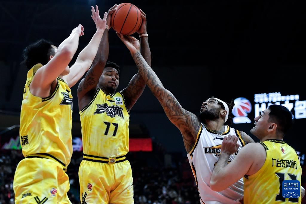 1月5日,辽宁本钢队球员莫兰德(右二)与吉林九台农商银行队球员皮特森(左二)争抢篮板球。新华社记者 许畅 摄