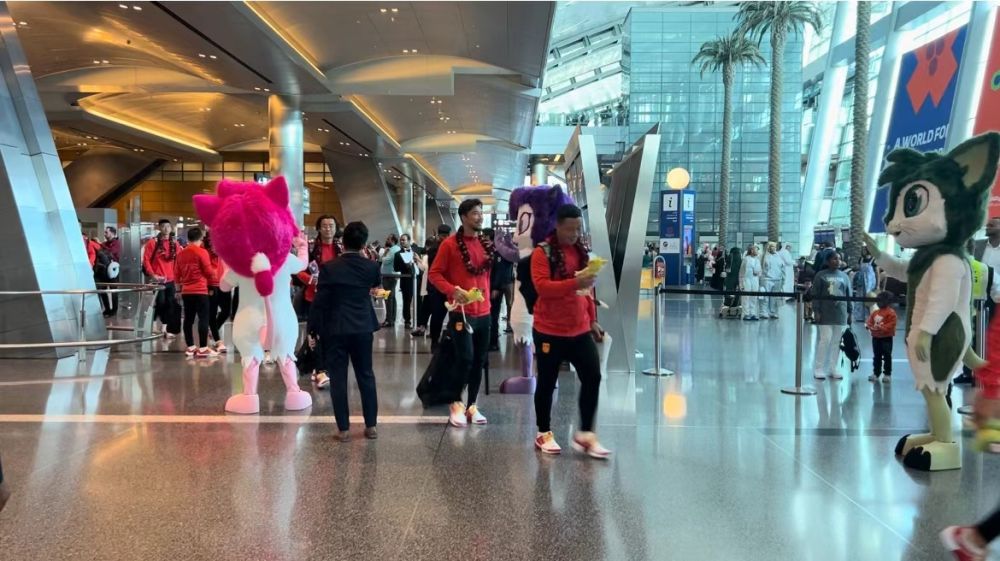 抵达多哈哈马德国际机场时,中国队整体状态显得较为放松,多名教练员和球员主动与亚洲杯吉祥物击掌。