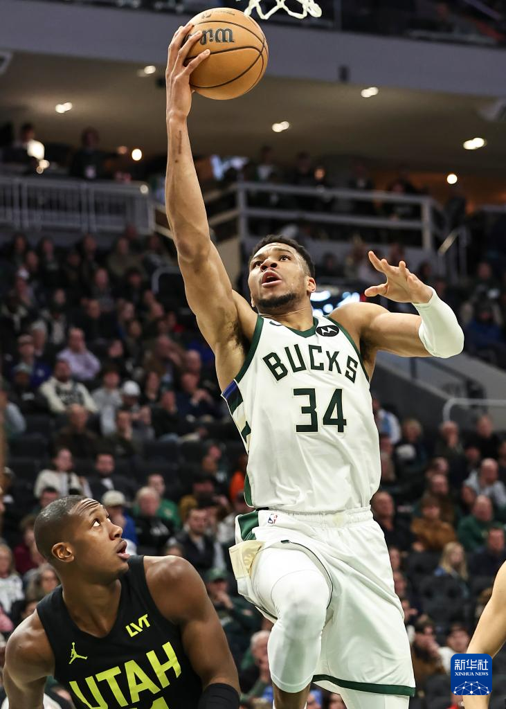 1月8日,雄鹿队球员安特托昆博(中)在比赛中上篮。新华社发(乔尔·莱纳摄)