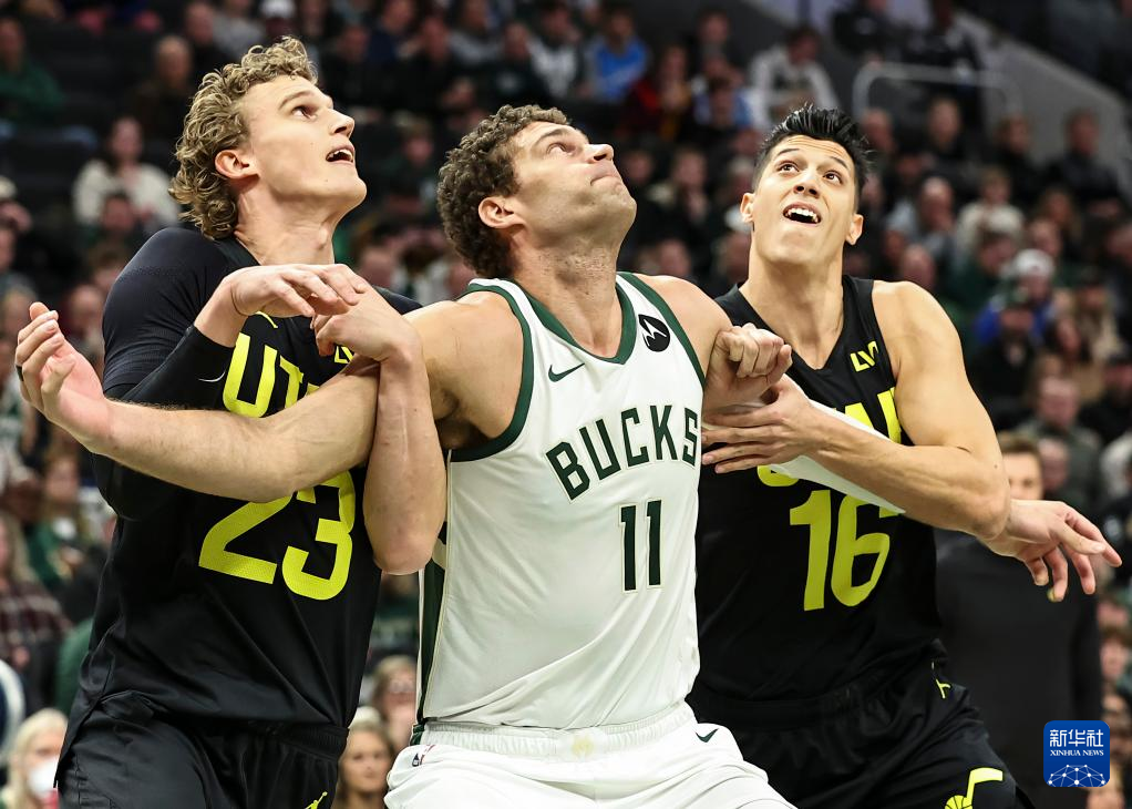 1月8日,爵士队球员马尔卡宁(左)、冯泰奇奥(右)在比赛中与雄鹿队球员洛佩兹争抢篮板。新华社发(乔尔·莱纳摄)