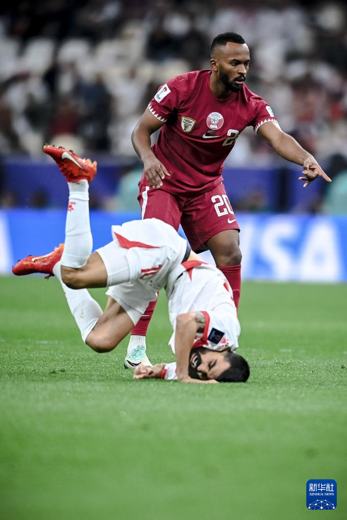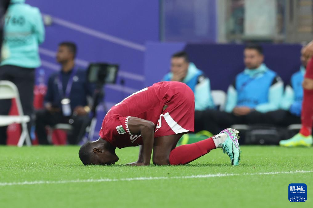1月12日,卡塔尔队球员艾哈迈德·法特希在比赛中受伤倒地。新华社记者 江汉 摄