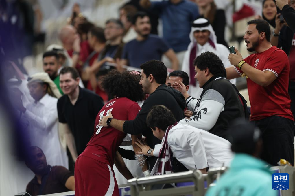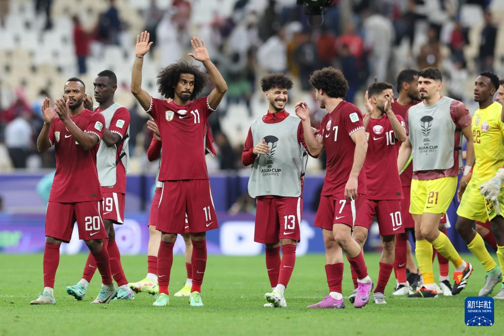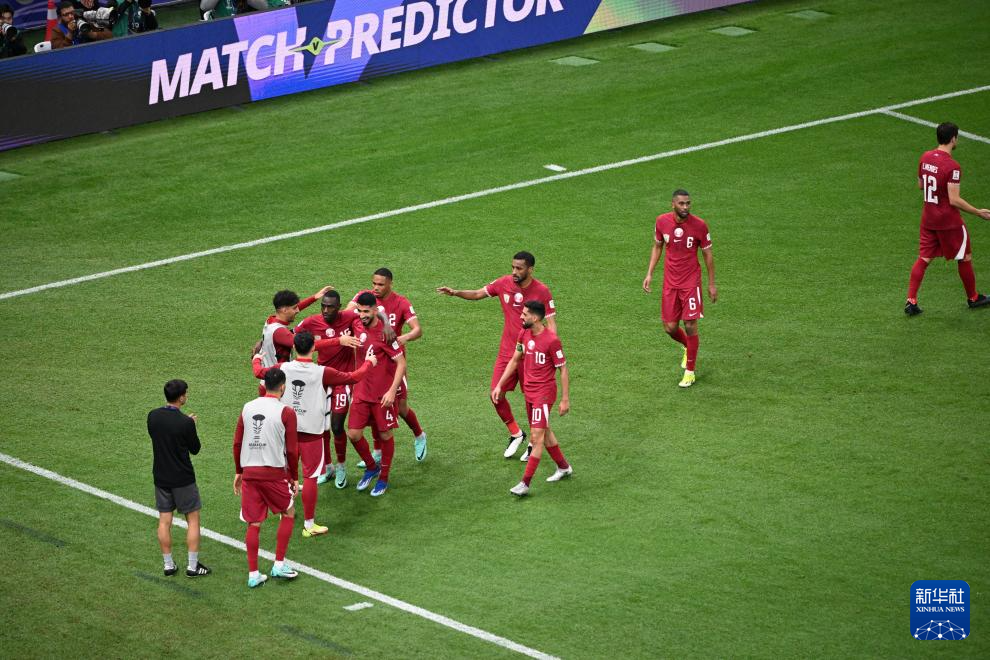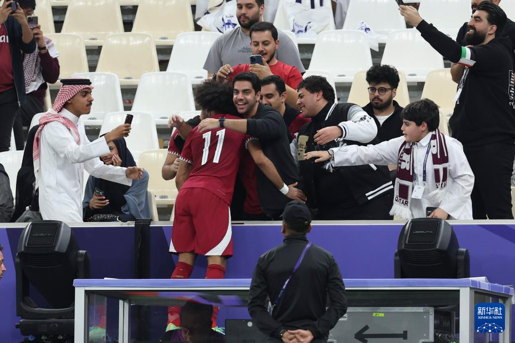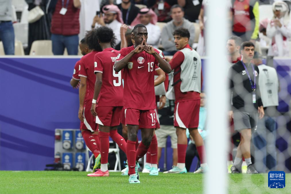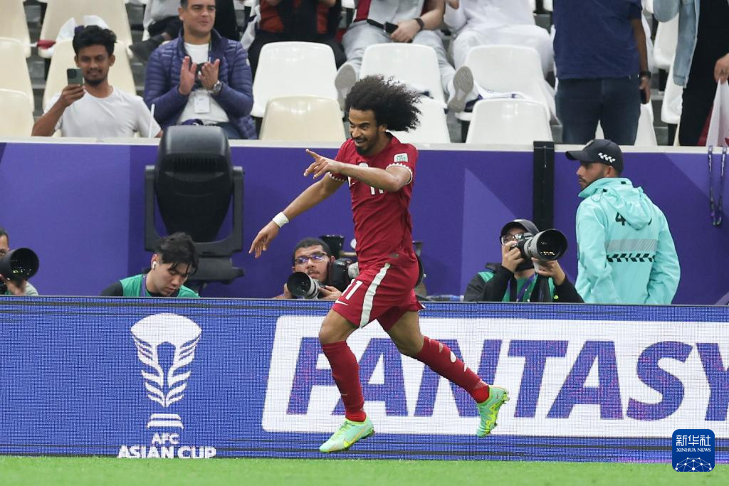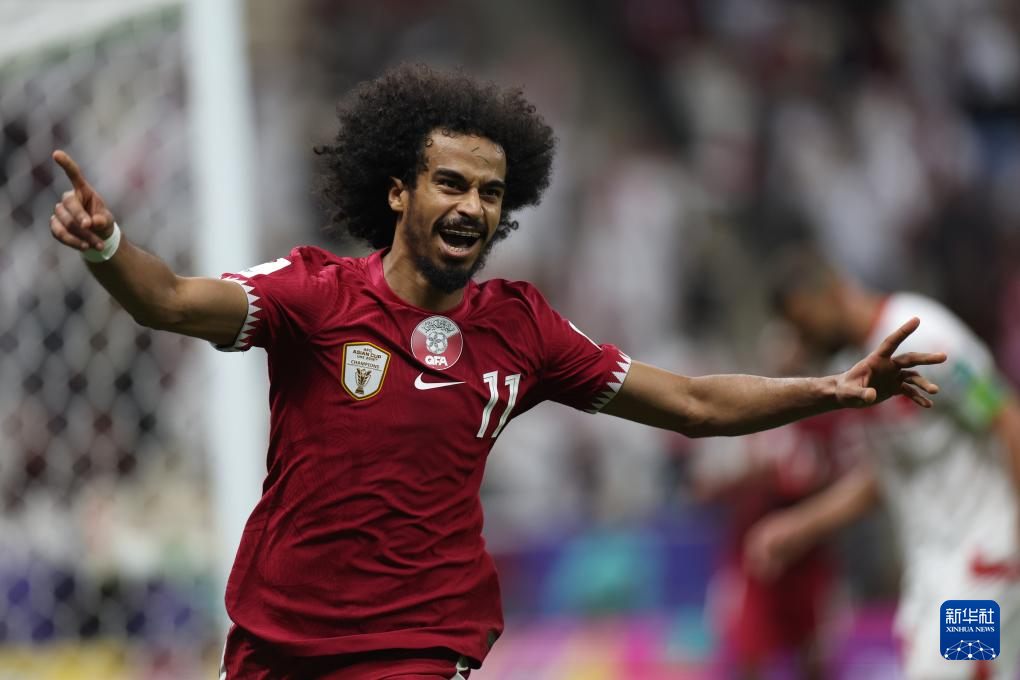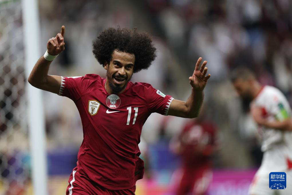 1月12日,卡塔尔队球员阿尔穆兹·阿里(中)在比赛中庆祝进球。新华社记者 曹灿 摄