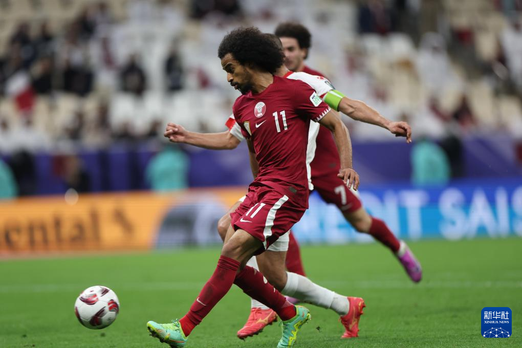 1月12日,卡塔尔队球员阿克拉姆·阿菲夫射门得分。新华社记者 曹灿 摄
