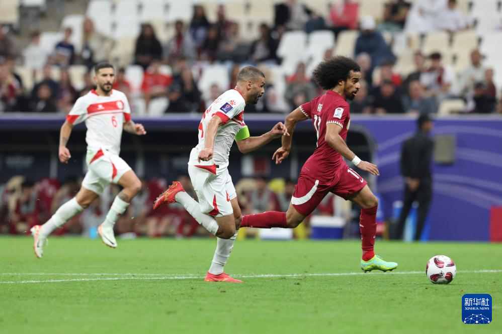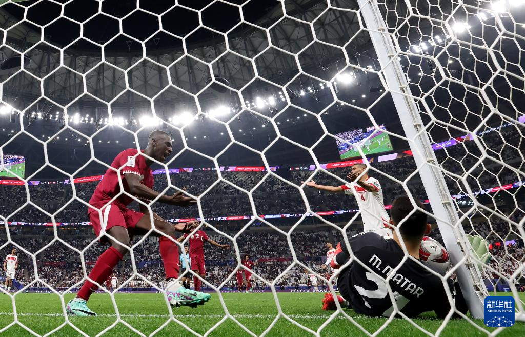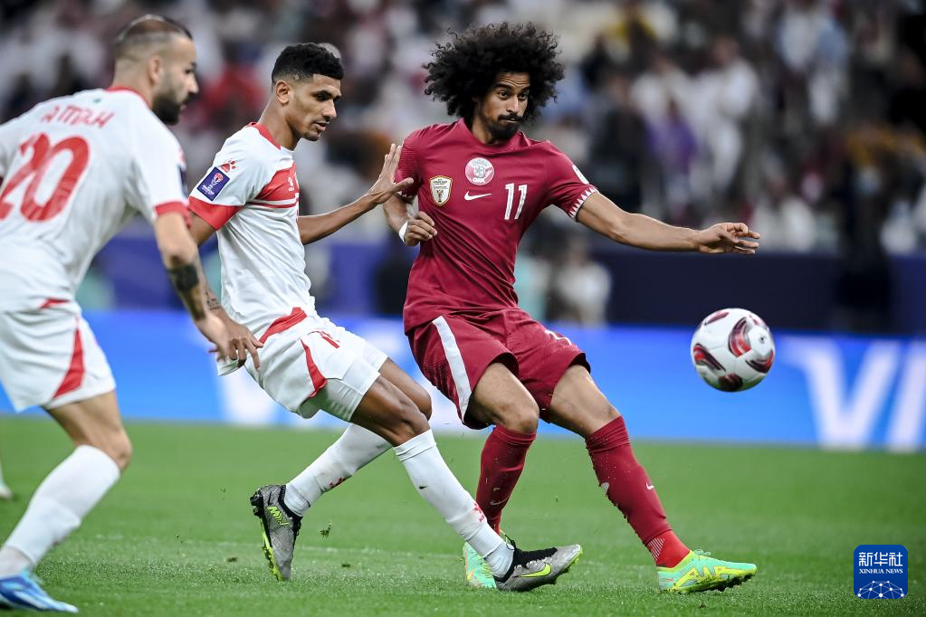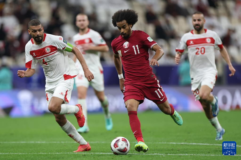 1月12日,卡塔尔队球员阿尔穆兹·阿里(左三)在比赛中破门得分。新华社记者 曹灿 摄